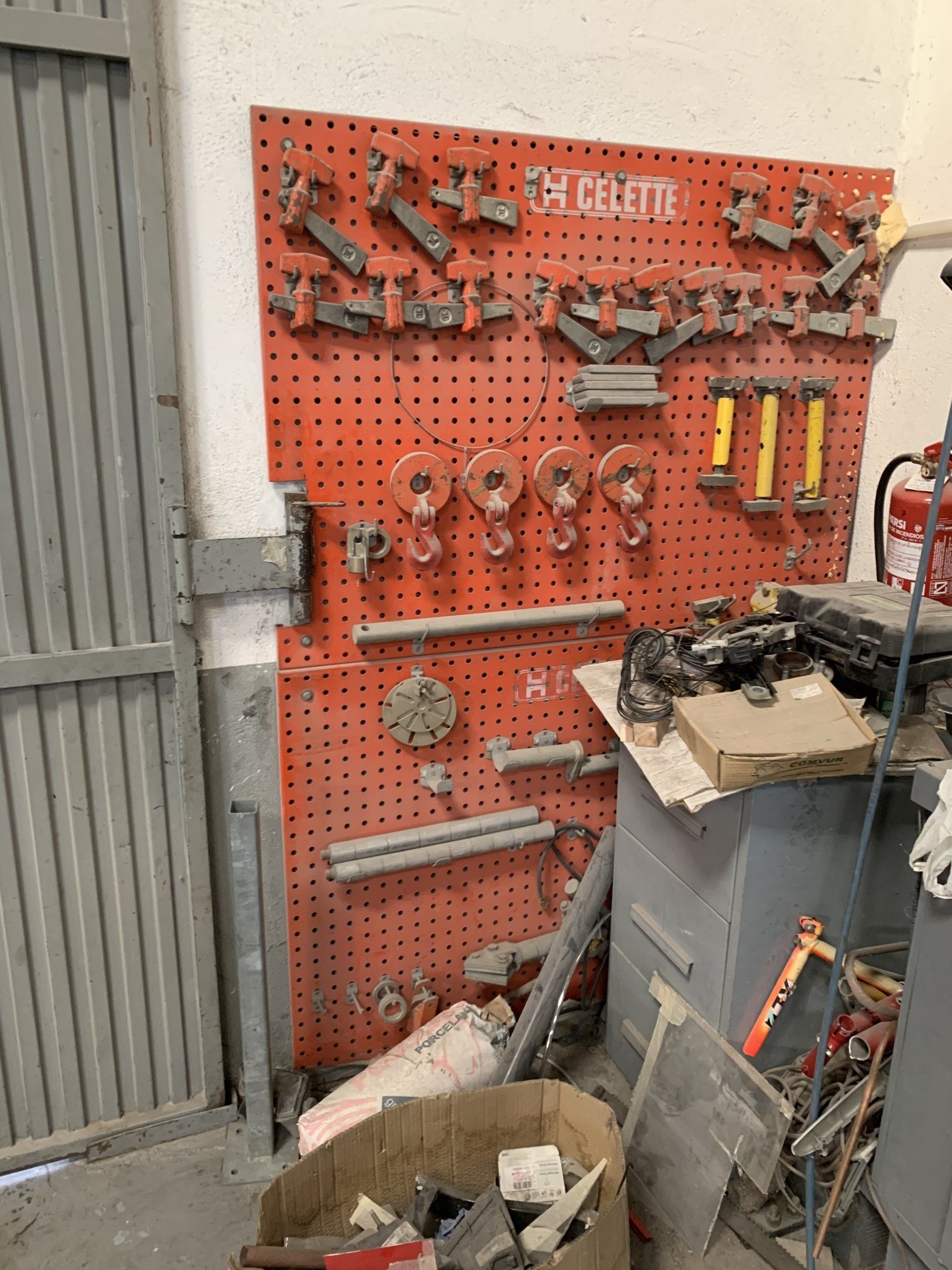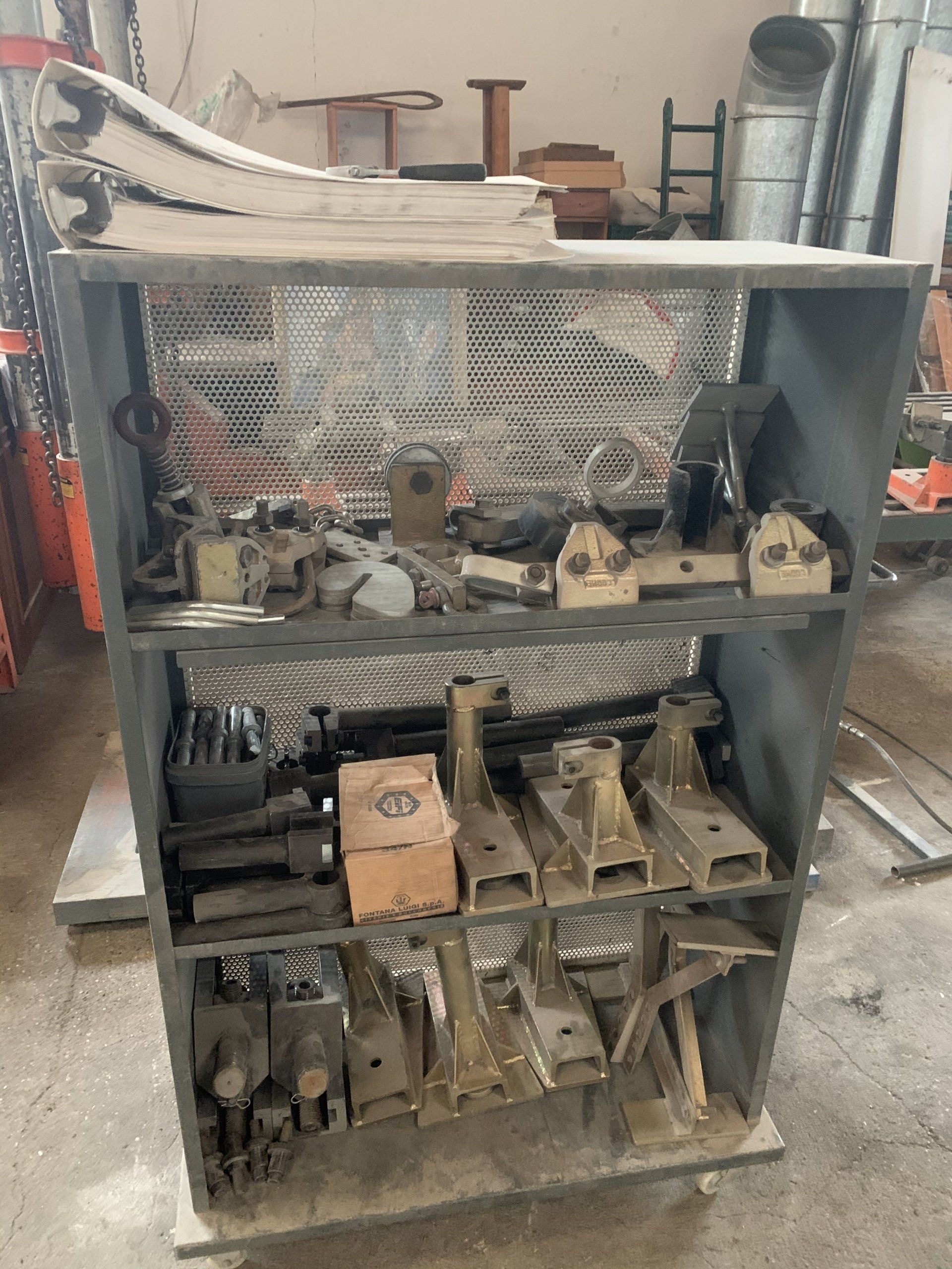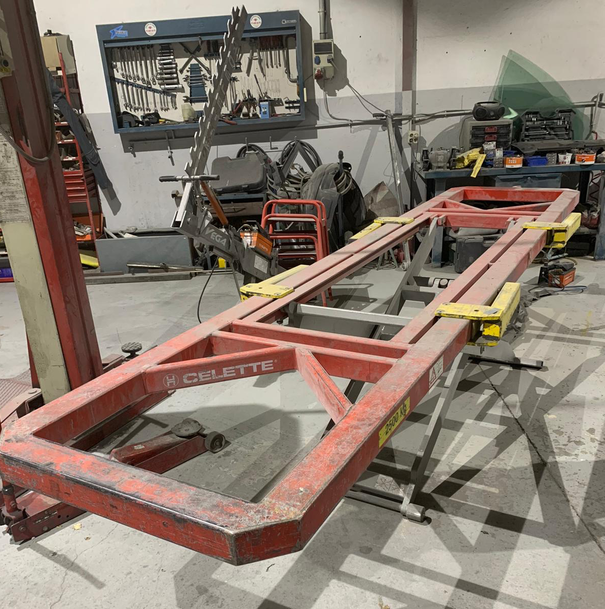 Bancada marca CELETTE modelo LAKUDA de 5 mt con sistema de elevación, 2 torres de tiro incorporadas más un estibador articulado móvil que permiten todo tipo de estiramiento alrededor de la bancada. con todo tipo de utillaje y fichas de vehículos, sistema medidor universal METRO 2000, cabestrante de subida