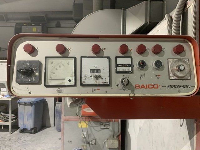 Cabina de pintura marca SAICO modelo NEW TRONIC de 6,00x4,00x2,60h altura de puerta del año 1999 con motor de impulsión de 7,5cv. Motor de extracción 7,5cv. Con carbón activo, quemador de gasoil de 140.000 kcal/h revisado.