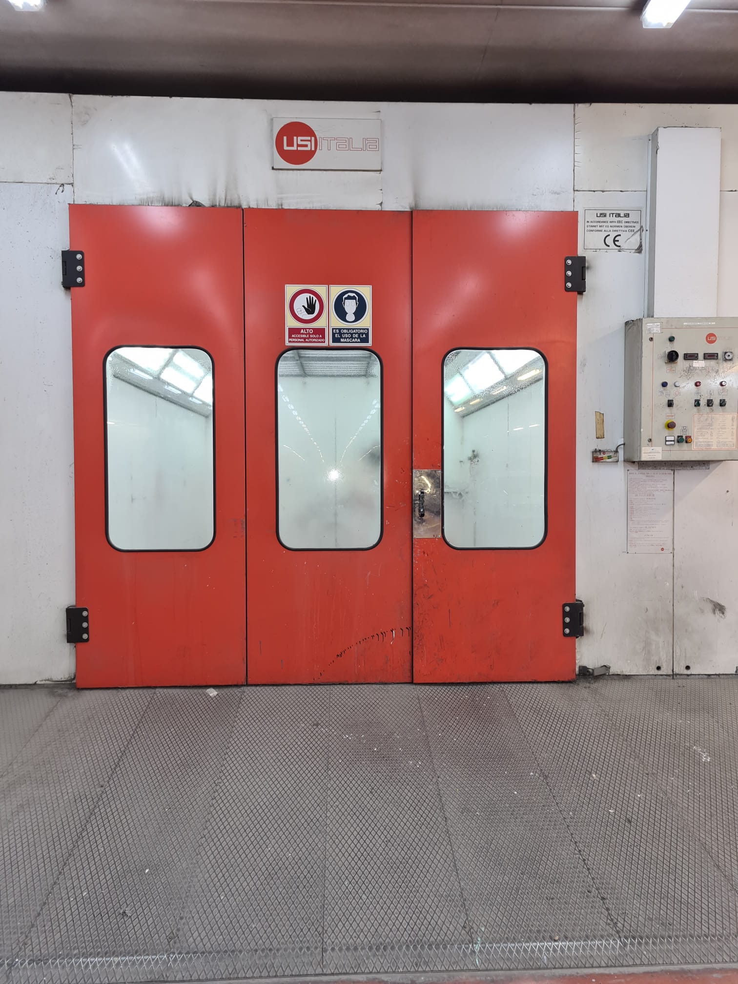 Cabina de pintura marca USI-CABINAUTO modelo GA 6,00x4,00x2,45 altura de puerta, año 1998 motor impulsión 5,5cv motor extracción 5,5cv con quemador de gasoil revisado con basamento metálico e iluminación superior.